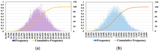 The uncertainty analysis of the results and discussion employed the Monte Carlo method, which described various random phenomena in the process. It is especially suitable for solving difficult and even impossible problems, and has an important position in the evaluation of uncertainty propagation. Therefore, a Monte Carlo simulation with ten thousand random numbers was used to consider the uncertainty propagation and deviation of materials and electricity depletion and to calculate the total effect and confidence interval (Figure 9a,b).