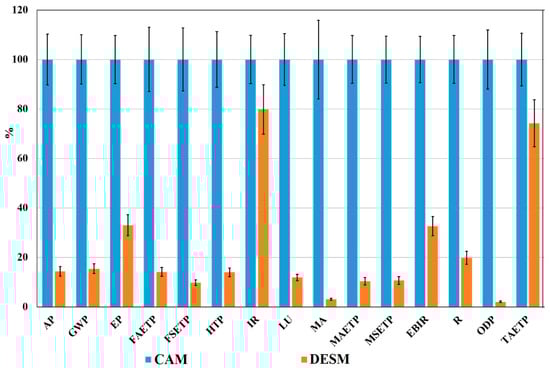 In this article, CML 2001 was used to assess wood pretreatment processes in 14 categories, including: land use (LU), sediment ecotoxicity, the aquatic ecotoxicity of freshwater (FSET and FAET); the ecotoxicity of marine sediment, marine aquatic, and terrene (MSET, MAET, and TAET), potential eutrophication and acidification potential (EP, AP), climate change (GWP), human toxicity (HTP), ionizing radiation (IR), photochemical oxidation (EBIR), stratospheric ozone depletion (ODP), and resources (R). The results of the EIs in 14 categories of CAM and DESM are shown in Figure 10. It can be seen that the EIs of DESM were lower than those of CAM, which was attributed to higher material consumption (the list of input materials and energy of CAM and DESM are provided in Table 1).