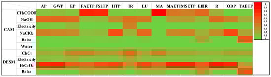 For DESM, the higher EIs contributed to climate change scores and human toxicity among 14 categories, which are clearly demonstrated in the sensitivity analysis results in color (Figure 11) and were caused by electricity consumption and preparation of the choline chloride. The phenomenon attributed to oxalic acid could be improved by changing hydrogen-bond donors (HBD) of DES to decrease EIs in DESM.