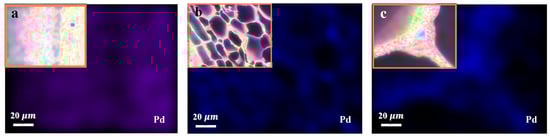 The unique combination of the chemical components, and abundant and active functional groups of wood resulted in an even distribution of Pd NPs. The EDS images show that the internal and external surface of DBSPd evenly distributed Pd NPs without agglomeration (Figure 12). Additionally, the EDS for Pd NPs loading weight percentage was about 6.14% (containing C, O, Zr, and Pd) (Table S2).