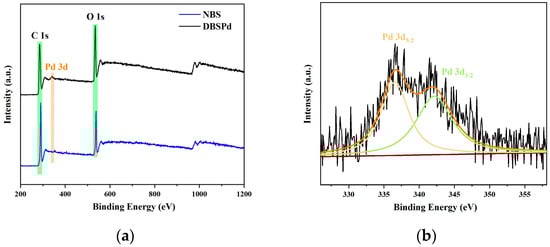 To further examine the chemical compositions and oxidation states of the Pd NPs of DBSPd, the XPS spectra of NBS and DBSPd are presented in Figure 13a. The peaks at 285, 341, and 532 eV corresponded to C 1s, Pd 3d, and O 1s, which indicate the Pd NPs loaded in DBS. In addition, the high-resolution XPS spectrum of the Pd 3d, respectively, showed double peaks at 335 and 342 eV (Figure 13b), and are attributed to Pd 3d5/2 and 3d3/2 []. These results show that Pd was successfully restored without any extra reducing agent.