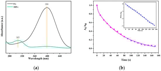 The DBSPd application in 4-NP reduction was further evaluated. 4-aminophenol (4-AP) is widely used in the manufacturing of articles for daily use (e.g., analgesic, photographic developer) as a multipurpose raw material. Wood possesses adsorbability to dyes, but little could be ignored compared to the catalytic reduction part due to the small dosage []. In order to highlight the dye adsorption of NBS, the NBS was soaked in a methylene blue solution. As Figure S1 shows, the NBS turns blue, indicating adsorption for the dye but no catalytic reduction. The 4-NP reduction dynamic measurement was conducted using DBSPd with 20 mg·L−1 concentration. The 4-NP Ultraviolet characteristic band (398 nm) disappeared and a new absorption band of 4-AP (305 nm) was generated (Figure 14a).
