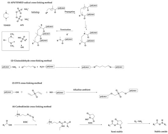 | Radical cross-linking | Relatively fast cross-linking reaction | Cito-toxicity of unreacted species Employable only with radical-sensitive polymers |