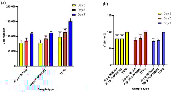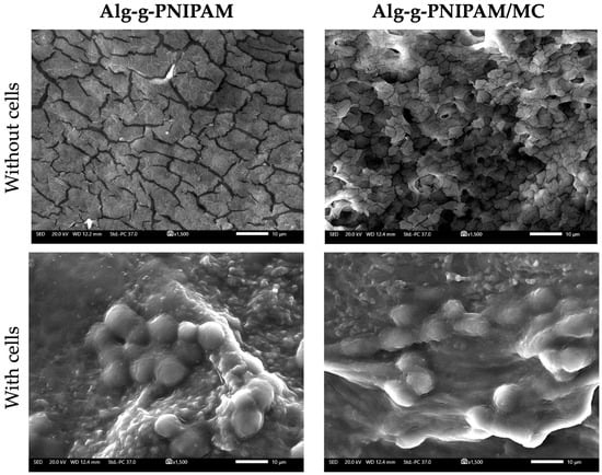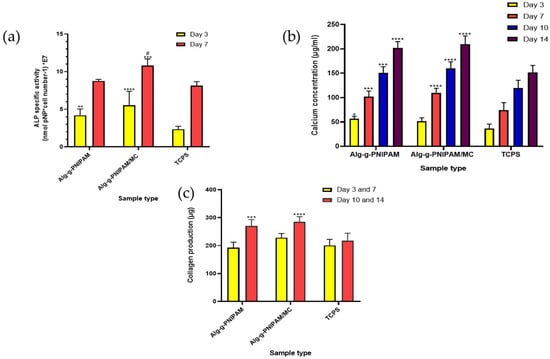 2.4.3. Evaluation of Osteogenic Differentiation Markers ALP Activity and Calcium and Collagen Production by Cells Cultured on Alg-g-PNIPAM and Alg-g-PNIPAM/MC Scaffolds