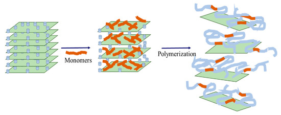 Different modification strategies were proposed to introduce the polymer in the interlayer space of layered structures. Clay-based materials were first proposed in the 1980s by Okada et al. at the Toyota Research Center in Japan [11]. The polymerization in the clay interlayer space was applied to design several polymer-based organoclays. For instance, nylon 6/montmorillonite nano-hybrid material contains an organic polymer and an inorganic phase layered clay [12,13,14,15]. Importantly, the preparation of organoclays generates high-performance polymer materials [16].