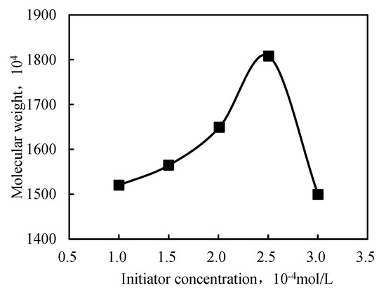 The initiator concentration impacted the polymer’s molecular weight, which tended to decrease as the initiator concentration increased. However, when the concentration was too low, the polymerization rate was slow, generating a polymer with a low molecular weight. When the initiator concentration was too high, the heat generated by polymerization could not be released, resulting in a low molecular weight. Therefore, a rational selection of the initiator concentration could obtain a high-molecular-weight polymer.
