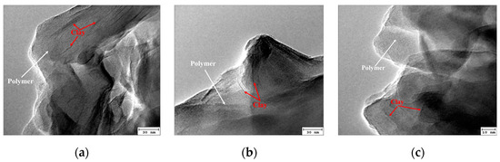 TEM images of the intercalated polymer synthesized under different initiator concentrations: (a) 1.0 × 10−4; (b) 1.5 × 10−4; (c) 2.5 × 10−4.