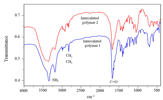 Figure 9 illustrates the FTIR spectrum of the intercalated polymer/clay nanocomposite. An obvious peak at 1670 cm−1 was observed for the polymer before and after the intercalation, which was attributed to the stretching vibration of the carbonyl group (C=O). The peaks at 3350 and 3200 cm−1 were attributed to the symmetric and asymmetric stretching vibrations of N-H in the polyacrylamide, respectively, suggesting that the polymer was successfully included in the nanocomposite.