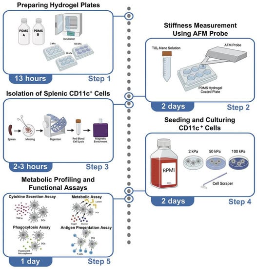 - Lee, M.; Chu, K.; Chakraborty, M.; Kotoulas, N.; Akbari, M.; Goh, C.; Clemente-Casares, X.; Winer, D.A.; Shrestha, A.; Tsai, S. PDMS hydrogel-coated tissue culture plates for studying the impact of substrate stiffness on dendritic cell function. STAR Protoc. 2022, 3, 101233. [Google Scholar] [CrossRef]