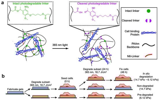 - Norris, S.C.P.; Soto, J.; Kasko, A.M.; Li, S. Photodegradable Polyacrylamide Gels for Dynamic Control of Cell Functions. ACS Appl. Mater. Interfaces 2021, 13, 5929–5944. [Google Scholar] [CrossRef]