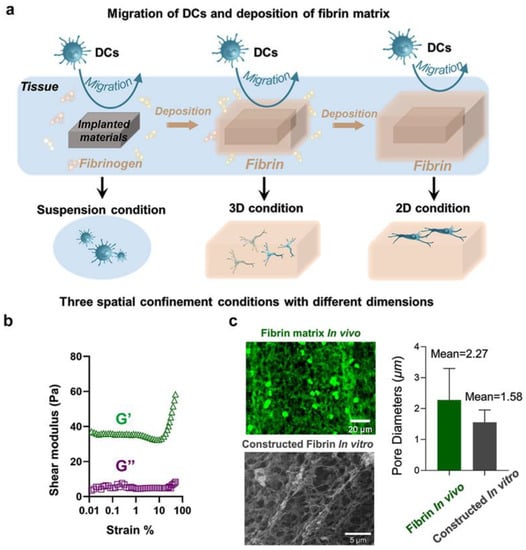 | Fibrin | Covalent interactions | Covalent bond interactions | BMDCs | DCs cultured on a 2D fibrin matrix display an elongated morphology, whereas DCs encapsulated in a 3D fibrin matrix spread in several directions. | [13] |
