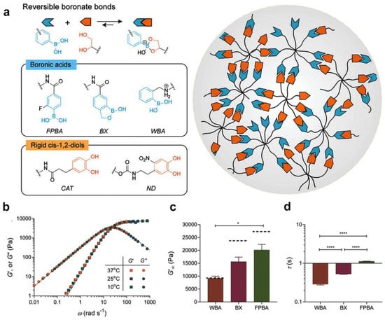- Marco-Dufort, B.; Tibbitt, M. Design of moldable hydrogels for biomedical applications using dynamic covalent boronic esters. Mater. Today Chem. 2019, 12, 16–33. [Google Scholar] [CrossRef]