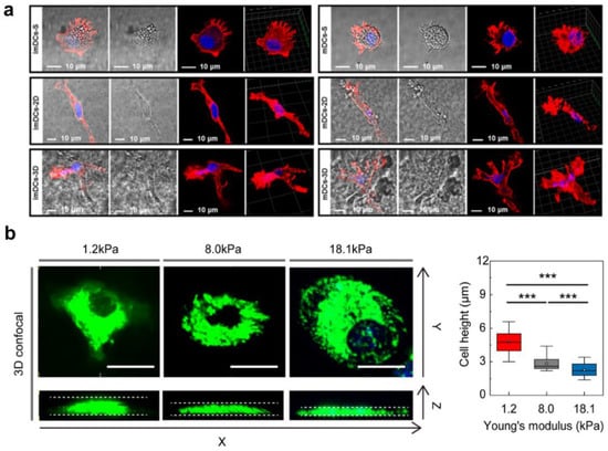 - Zhong, J.; Yang, Y.; Liao, L.; Zhang, C. Matrix stiffness-regulated cellular functions under different dimensionalities. Biomater. Sci. 2020, 8, 2734–2755. [Google Scholar] [CrossRef] [PubMed]