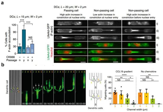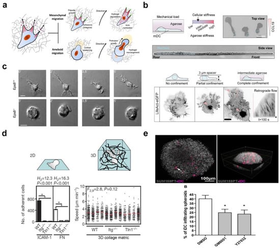- Choi, Y.; Kwon, J.-E.; Cho, Y.-K. Dendritic Cell Migration Is Tuned by Mechanical Stiffness of the Confining Space. Cells 2021, 10, 3362. [Google Scholar] [CrossRef] [PubMed]
