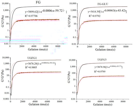 In order to evaluate the influence of time on the gelation behavior of UG-treated gelatin, the changes in G′ and G″ were measured to evaluate the gelation behaviors. As shown in Figure 1, at the first 1000 s, the G′ of all gelatin systems increased at a faster rate and then continued to increase at a slower rate. During the gelling process, when G′ > G″, the colloid forms. The gelatin gelation process, which involves the gelatin molecule changing from an irregular coil to a three-strand spiral, is mainly affected by the pH, gelatin concentration, temperature, and salt [1,4]. Once the colloidal network structure was formed, along with further gelation procedure, the G’ continued to increase at a slower rate, indicating the continued generation of a three-strand helix, and the gel network structure was further enhanced [22]. In this study, the original gelatin gel had a slightly higher G′∞ than the others, indicating that the formation of the FG-GLU complex coacervates and conjugates decreased the triple-helix contents in all treated gelatin gels [4]. Nevertheless, the constant gelation rate (k) of all gelatin gels forming curves had non-significant changes, and the modification methods obviously increased the tg, especially for UGFG1 and UGFG3 (Table 2). The introduction of GLU may have increased the electrostatic repulsion in the composite system, which reduced the fluidity of the FG molecules [14]. Moreover, the formation of FG-GLU conjugates may have decreased the hydrogen bonds in the gelatin, disturbing the formation of the gel.