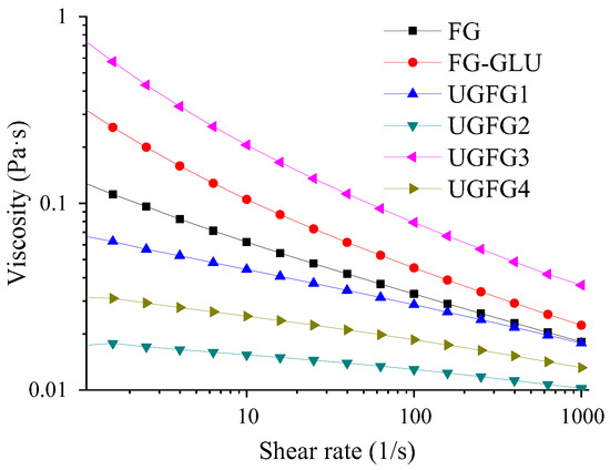 Figure 2 shows that the apparent viscosity of the samples decreased with the shear rate, demonstrating that the unmodified and modified gelatin solutions still had typical pseudoplastic behavior [20]. FG-GLU had a higher viscosity than that of the original FG; this might be because the FG interacted with the GLU to form a soluble complex. In theory, Maillard reaction products (MRPs) have higher molecular weights, which could contribute to the increased viscosity of the gelatin. Meanwhile, all the UG-treated samples had a lower viscosity (except UGFG3) than those of the untreated one. This may be attributed to the attachment of the GLU groups to the gelatin molecules, which changed the surface charges of the gelatin molecules. This is similar to the results of Zhao et al. [4], who reported that glycosylation with gum arabic decreased the viscosity of FG. This difference might be closely related to the treatment conditions and sugar.