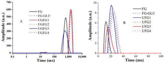 UG treatment influence on the relaxation time distribution ((A): 0–10,000 ms; (B): 0–100 ms) in the gelatin gels.