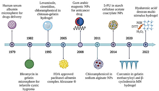 A brief history of the development of natural polymer applications in drug delivery systems. 5-FU: 5-fluorouracil; DTT: dithiothreitol; FDA: food drug administration; NIR: near infrared radiation; NPs: nanoparticles.