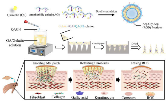 Schematic representation of the amphiphilic gelatin nanocarrier loaded with quercetin preparation and the mechanism of drug release. Keloid scarring can be treated by the transdermal delivery of drug combinations (Qu and gallic acids) via actions of gelatin-based MN composite heterogeneously. Adapted from Chen et al. [22].
