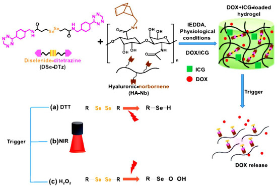 In addition, multi-stimuli responsive HA-hydrogels were effectively formulated with cross-linker diselenide bonds for precise release of DOX as shown in Figure 4 [38]. DOX-loaded hydrogel resulted in an antitumor impact in breast cancer cells (BT-29). Incorporating indocyanine green (ICG) into the DOX-loaded hydrogel further improved the antitumor efficacy of DOX. Drug contents in DOX/ICG-loaded hydrogel were higher compared to DOX-loaded hydrogel, 94% and 4.54%, respectively. Thus, this study summarized that multi-responsive HA-hydrogel can be achieved by incorporating multiple cleavable bonds using diselenide bonds and the result showed a great efficacy of DOX-loaded hydrogel compared to free DOX and the addition of ICG has further improved the system.