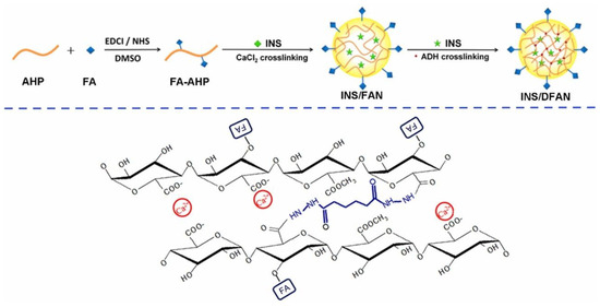 Therefore, Figure 5 shows a preparation of insulin DDS using folic acid (FA)-modified pectin nanoparticles (INS/DFAN). This system was prepared by a dual-crosslinking process using calcium ions and adipic dihydrazide (ADH) as crosslinkers to overcome the limitations [39]. Initially, pectin in this study was isolated from head residues of sunflower to produce low-methoxyl pectin (AHP). Findings from in vitro experiments showed the insulin dispersion behaviors of INS/DFAN influenced by the COOH/ADH molar ratio in the dual-crosslinking procedure. INS/DFAN can efficiently prevent the untimely release of insulin compared to ionic-crosslinked nanoparticles (INS/FAN). INS/DFAN also exhibited high encapsulation efficiency, excellent stability, and enhanced insulin delivery, whereas in vivo experiments on type 1 diabetic rats demonstrated improved hypoglycaemic effects and improved insulin bioavailability over INS/FAN. Overall, the combination of dual crosslinking and FA modification on pectin nano-vehicles was found to serve as a good strategy to enhance oral insulin delivery.