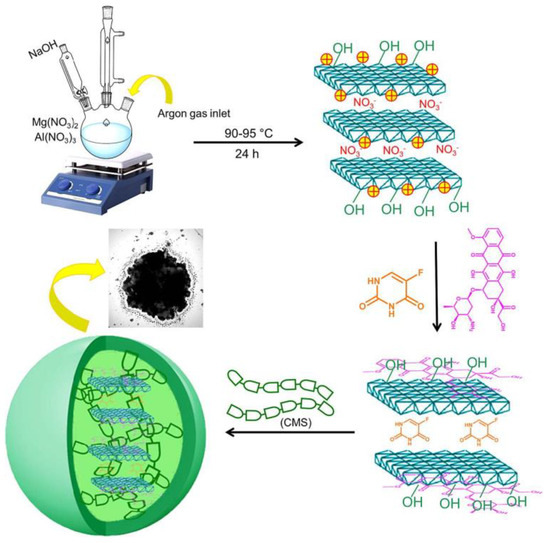 Targeting colon cancer therapy concurrently uses co-loaded DOX and 5-Fu on as-created layered double hydroxides LDH(Mg-Al) (LDH(MgAl)@DOX,5-Fu) [44]. The system was then encapsulated into carboxymethyl starch, forming CMS@LDH(MgAl)@DOX,5-Fu microspheres. It presented a reassuring constant drug release pattern and precise release profile of DOX and 5-Fu of ~22% and ~29%, respectively. The findings suggested the potential of the proposed microsphere for oral co-drug delivery. Figure 6 below illustrates the research of CMS@LDH(MgAl)@DOX,5-Fu microspheres.