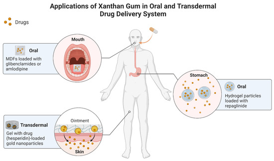 Summary of applications of xanthan gum (XG) in oral and transdermal drug delivery systems (DDS). Oral DDSs can be achieved by incorporating XG-based hydrogel particles loaded with repaglinide to treat type 2 diabetes and XG-based mouth-dissolving films (MDFs) loaded with glibenclamide to treat type 2 diabetes or amlodipine to treat hypertension. Transdermal DDSs can be achieved by incorporating XG-based gel with hesperidin-loaded gold nanoparticles to treat P. vulgaris infection.