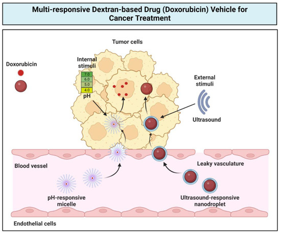 Multi-responsive dextran-based drug delivery vehicle to deliver doxorubicin (DOX) drug for cancer treatments. DOX is loaded into dextran-based micelles that are responsive to internal stimuli (i.e., changes in the pH tumor environment). DOX also can be loaded into a dextran-based nanodroplet that is responsive to external stimuli such as ultrasound. This multi-responsive DDS allows drugs to be delivered in a more targeted manner such as in tumor cells. The micelles and nanodroplets enter the tumor environment through leaky vasculature. DOX will only be released into the tumor cells upon response to pH changes or ultrasound stimuli.