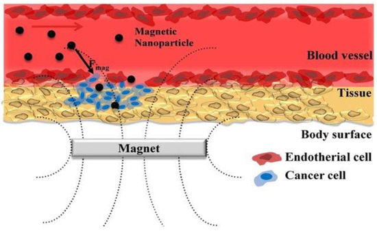 The three main goals of drug delivery are to deliver medicine to the right location, reduce the medication’s adverse effects on neighboring organs or tissues, and control the medication’s release to stop the cycle of over- and under-dosing [69,70]. These objectives may be accomplished by utilizing Fe3O4 MNPs because of their distinctive characteristics, magnetism, and simplicity of manipulation using an EMF, which sends drug-carrying Fe3O4 MNPs to the targeted location directly (as shown in Figure 9).
