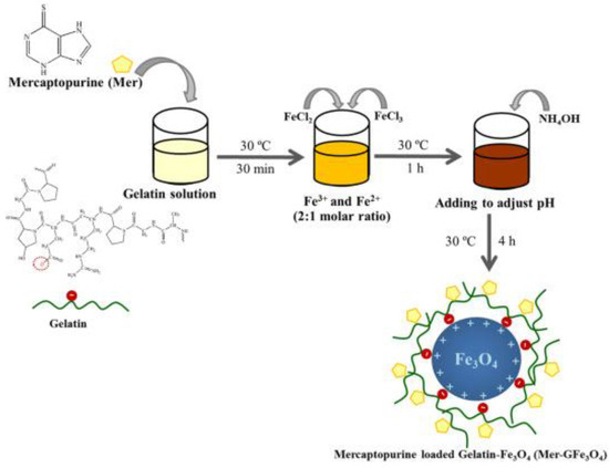Proposed mechanism interaction between Fe3O4, gelatin, and loaded drug. Adapted from Sirivat et al. [91].