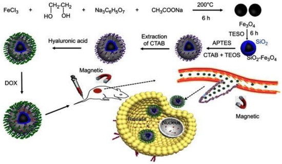 Sirivat and Paradee [91] prepared gelatin-coated Fe3O4 (GFe3O4) composites, as illustrated in Figure 10, with superparamagnetic characteristics that are significant in preventing particle agglomeration and facilitating the rapid dispersion of the particles upon the removal of the EMF [92]. Moreover, although the use of HA-drug conjugates in DDSs has received a lot of attention in recent years [93,94], they do not effectively bind to targeted cancer cells. Fang et al. [95] overcame this issue by developing a more efficient drug delivery system, as displayed in Figure 11 through the modification of mesoporous silica-coated Fe3O4 nanoparticles (MSNs) with HA, then loading with DOX. The DOX-HA-MSNs showed remarkable targeting ability as well as efficient anticancer activity both in vitro and in vivo.