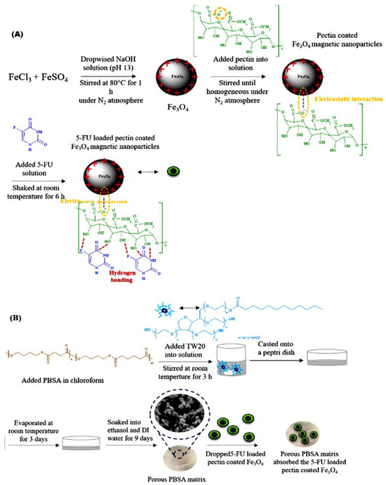 Illustration of (A) 5-fluorouracil-loaded pectin-coated Fe3O4 MNPs; (B) porous poly(butylene succinate co adipate). Adapted from Viratchaiboott et al. [96].