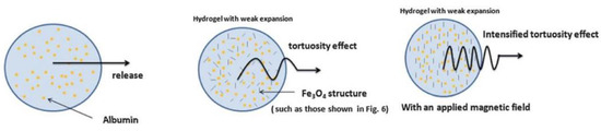 Albumin release from a hydrogel without and with an applied magnetic field: a proposed mechanism. Adapted from Guilherme et al. [97].