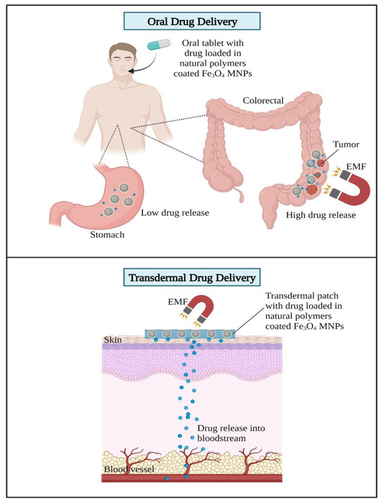 Next, the transdermal administration of drugs by delivering them into the bloodstream through the skin using a patch has been recently proposed in Fe3O4 MNPs [96]. The transdermal administration of drugs prevents the first-pass metabolism effects of drugs, which are able to lower the dose of drugs administered and reduce toxicity [102]. Harnessing the advantages of MNPs under the combined influence of magnetic and electric fields increases the efficacy of transdermal drug delivery and allows for a more controlled release of the drug at the target site. The mechanism of action of Fe3O4 MNPs in delivering drugs using oral and transdermal routes of administration is illustrated in Figure 14.