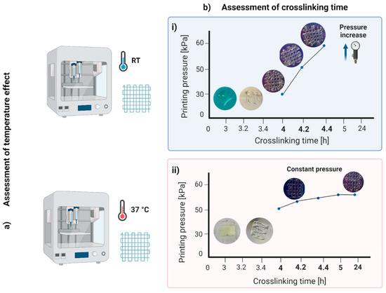 Layer-stacking or -merging results: assessment of (a) temperature and (b) cross-linking time effect. (i) The hybrid hydrogel printed at room temperature (RT) was suitable for printing from 4 to 4.4 h after the addition of the Star-PEG-MA; (ii) hybrid hydrogel printed at 37 °C was suitable for printing from 4 to 24 h after the addition of the Star-PEG-MA.