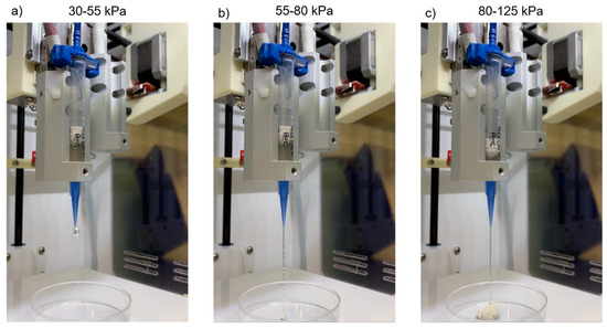 Results of the droplet/fiber formation test for Sample A. (a) In the pressure range of 30–55 kPa, hydrogel accumulation occurred at the nozzle outlet; (b) at 55–80 kPa, the formation of irregular fibers was observed; (c) at 80–125 kPa, regular/smooth fibers were formed.