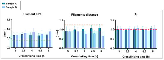 The filament dimensions obtained were greater than the ideal size, defined by the nozzle diameter (0.41 mm). The filaments’ distance was consequently less than the target value. Finally, the Pr demonstrated values slightly greater than 1, suggesting an irregular geometry.