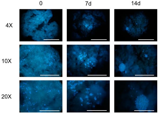 Images from fluorescence microscope (Olympus CX41) at different magnifications (4×, 10×, 20×) of the constructs printed with an initial concentration of 2 × 106 UMR-106 cells/mL at different time points. Nuclei stained by Hoechst 33342. Scale bar 1 mm (4×), 500 μm (10×), 250 μm (20×).