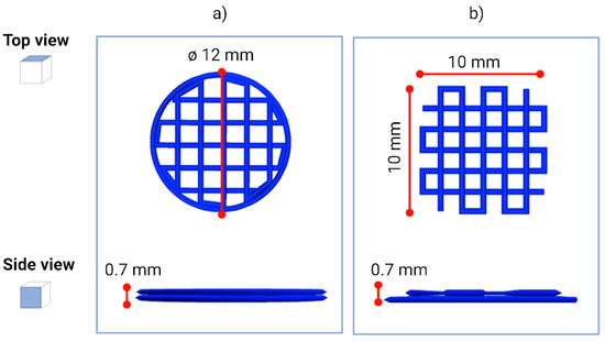 Using Autodesk Inventor® software (2021), we created a 12-millimeter-diameter cylindrical structure (Figure 8a) and a square structure with sides measuring 10 mm (Figure 8b). Height of both structures was set at 0.70 mm. Next, the CAD model was sliced using Slic3r, an open-source slicing software. During the slicing process, some parameters were defined, such as layer height, number of perimeters, printing speed, and infill percentage. The infill parameter is crucial for 3D BioP as it determines the distance between two adjacent fibers, i.e., it defines the pore size of the scaffold. The pore size is a crucial factor, as it guarantees the correct supply of nutrients and oxygen to cells, guaranteeing their growth. After the slicing, we obtained for the cylindrical structure a geometry with a 30% infill, while for the square structure, we obtained a geometry with a 20% infill. Both structures consisted of two layers 0.35 mm high. The printing speed was fixed at 450 mm min−1, which, combined with pauses at each change in extruder trajectory, allowed the correct adhesion of the hydrogel on the Petri dish. The G-code was created and constructs were 3D-printed. We printed the square scaffold for the printability-resolution tests, while the cylindrical structure was used for the biocompatibility tests. For this second case, we printed scaffolds using both the bioink and the biomaterial ink.