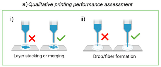 Layer stacking or merging: this test of qualitative printability assessment is designed to evaluate the hydrogel’s ability to form self-supporting 3D structures. Fibers must be able to stack layer-by-layer without merging. A simple test for layer stacking consists of generating, through BioP, multilayer grids (typically planar structures composed of 1–2 layers) [41]. The realization of grids with well-defined pores indicates a passed test, while a collapsed structure indicates a failed test [8,9,11] (Figure 9ai).