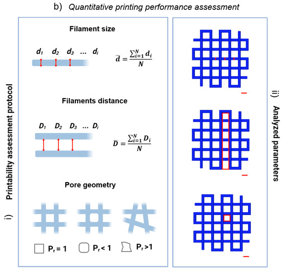 - Pore geometry or printability index: the optimal shape of pore geometry is rectangular, which indicates the ideal filament (Figure 9bi,ii). This evaluation was performed using the printability index () [41], calculated as:where L and A are pore perimeter and area, respectively. The Pr index is higher than 1 for irregular structures, 1 in case of perfect square pores, and lower than 1 for circular pores.