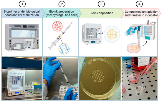 Three-dimensional-bioprinting procedure. It starts with (1) the positioning of the bioprinter under a biological hood and UV light sterilization. (2) Next, bioink is prepared by mixing cells and hydrogel and (3) finally printed. (4) Culture medium is added and 3D structures are placed inside the incubator.