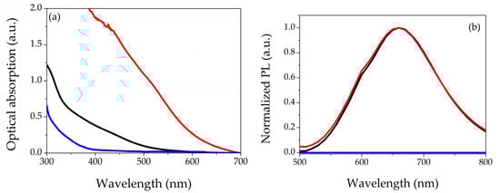 Optical characterizations: (a) UV-Vis optical absorption of AgNCs-PMAA colloidal solution (black curve), dried hydrogels with (red line) and without (blue curve) AgNCs-PMAA; (b) normalized photoemission spectra excited at λ = 430 nm of AgNCs-PMAA colloidal solution (black curve), dried hydrogels with (red line) and without (blue curve) AgNCs-PMAA.