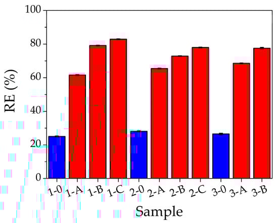 Pb(II) filtering tests were carried out in static conditions: a single filter was immersed in a beaker containing 10 mL of Pb(II) polluted water for 24 h and at T = 25 °C. To select the best composition of filter, the quantities of PEGDA (14%, 19%, and 24% in wt.) and AgNCs (from 0 to 255 mg) were varied. These hydrogels were kept in contact with a solution of 1500 ppm of Pb(II) ions, and subsequently, the adsorption percentage was evaluated to select the best composition of sorbent material. The RE percentage was calculated by applying the following formula: