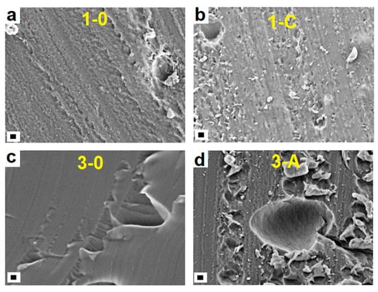 SEM images of (a) sample 1–0 with 14%wt of PEGDA and without AgNCs; (b) sample 1-C with 14%wt of PEGDA and 255 mg of AgNCs-PMAA; (c) sample 3–0 with 24%wt of PEGDA and without AgNCs; (d) sample 3-A with 24%wt of PEGDA and 180 mg of AgNCs-PMAA (scale bar 1 µm).