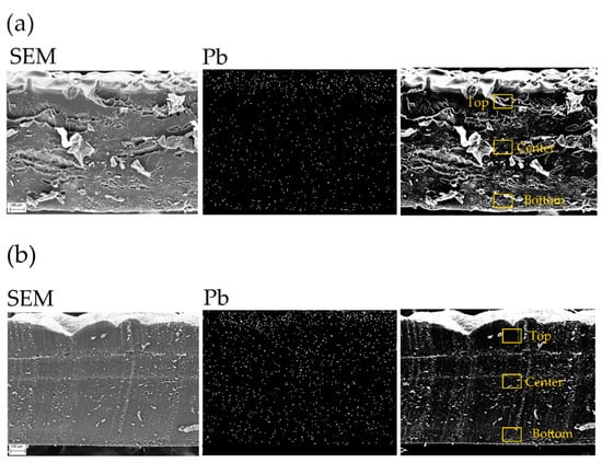 EDX analyses results of 14% PEGDA samples without (1–0, (a)) and with (1-C, (b)) after the filtration of 1500 ppm Pb(II). For each sample, the SEM image of the recorded area and the Pb distribution map are reported. The yellow boxes in the third panel underline the areas where the localized EDX spectra were acquired. The obtained elemental distributions of localized analyses are reported in Table S1.