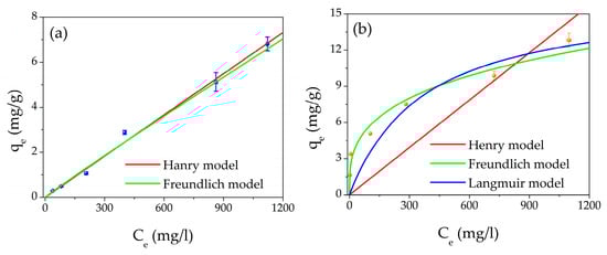 where KHE represents Henry’s partition coefficient calculated by the slope of the experimental fit. This constant is related to the interaction that occurs among adsorbate and adsorbent, or in other words, how the adsorbate is partitioned between the solution and the filter. The Henry model describes a weak interaction between adsorbate and adsorbent of the electrostatic or van der Waals kind or hydrophobic interactions [].