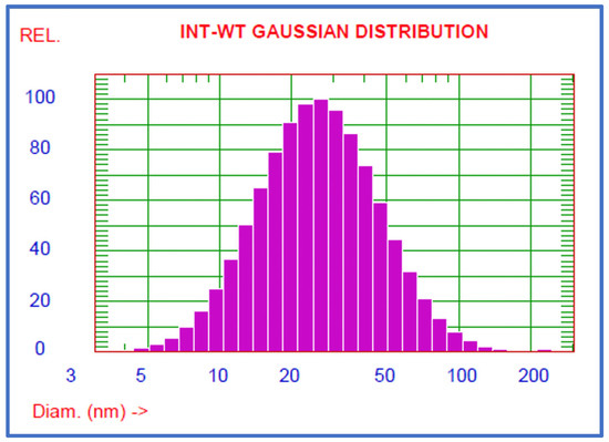 The size of the nanocarrier is an important parameter for its in vivo performance and its ability to accumulate in the target areas, such as tumour tissues. Taking into consideration both pharmacodynamic and pharmacokinetic aspects, it was estimated that the advantageous size of an anticancer drug carrier should be in the range between 20 and 200 nm. The results of particle size and distribution measurement using the DLS technique are shown in Table 3 and Table 4. An example of the plot obtained from the DLS size measuring equipment, which presents the Gaussian distribution of the micelles size, is shown in Figure 3.