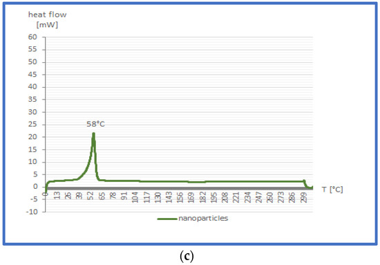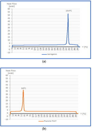 As recorded in the DCS curves (Figure 4a–c), the melting point of free naringenin was approximately 254 °C, whereas the narrow and sharp Pluronic F127 melting peak was found at about 59 °C. Naringenin-loaded nanomicelles exhibited an endothermic peak at nearly the same temperature as Pluronic—namely 58 °C; however, the peak’s shape was broader. The melting transition peak of naringenin disappeared in the case of the nanomicellar formulation. In the literature [32], the disappearance of the endothermic peak of the drug in a nanocarrier indicates its amorphous state, and consequently means that the flavonoid has been fully encapsulated into polymer [31].