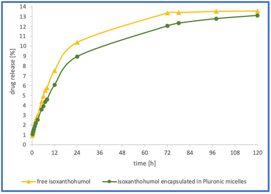 From the group of xanthohumols, a sample containing isoxanthohumol was chosen from a technical point of view. The solubility in water is very low; therefore, it was more feasible to measure the release profile measurement of isoxanthohumol, which exhibits a solubility that is nearly four times higher in aqueous solutions than its isomer [33]. Investigation of the in vitro release of encapsulated isoxanthohumol revealed that polymeric micelles based on Pluronics P123 and F127 were not able to enhance its water solubility effectively. As shown in Figure 6, only 13% of the flavonoid was released after 120 h, which is similar to the 14% value obtained for crude isoxanthohumol. The differences between the release profiles of both samples were negligible, and thus it could be assumed that the encapsulation in Pluronics did not change the release behaviour of isoxanthohumol. Finally, the conclusion that can be drawn is that Pluronics P123 and F127 are not effective carriers for the delivery of isoxanthohumol. This may be a result of the high hydrophobicity of isoxanthohumol, which stems from the presence of the prenyl group in this molecule, and this hydrophobicity cannot be overcome by a designed mixed micellar system.